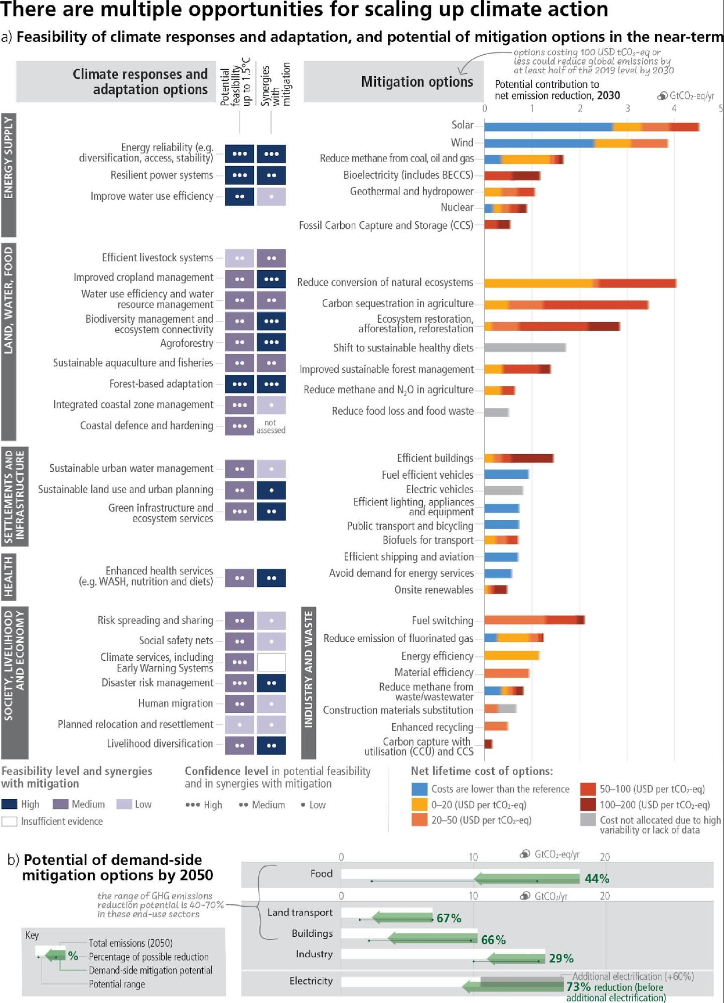 Feasible, effective and low-cost options for mitigation and adaptation are already available (high confidence) (Figure 4.4). Mitigation options costing USD100 per tCO2-eq or less could reduce global GHG emissions by at least half the 2019 level by 2030 (options costing less than USD20 tCO2-eq–1 are estimated to make up more than half of this potential) (high confidence) (Figure 4.4). The availability, feasibility95 and potential of mitigation or effectiveness of adaptation options in the near-term differ across systems and regions (very high confidence). {WGII SPM C.2; WGIII SPM C.12, WGIII SPM E.1.1; SR1.5 SPM B.6}