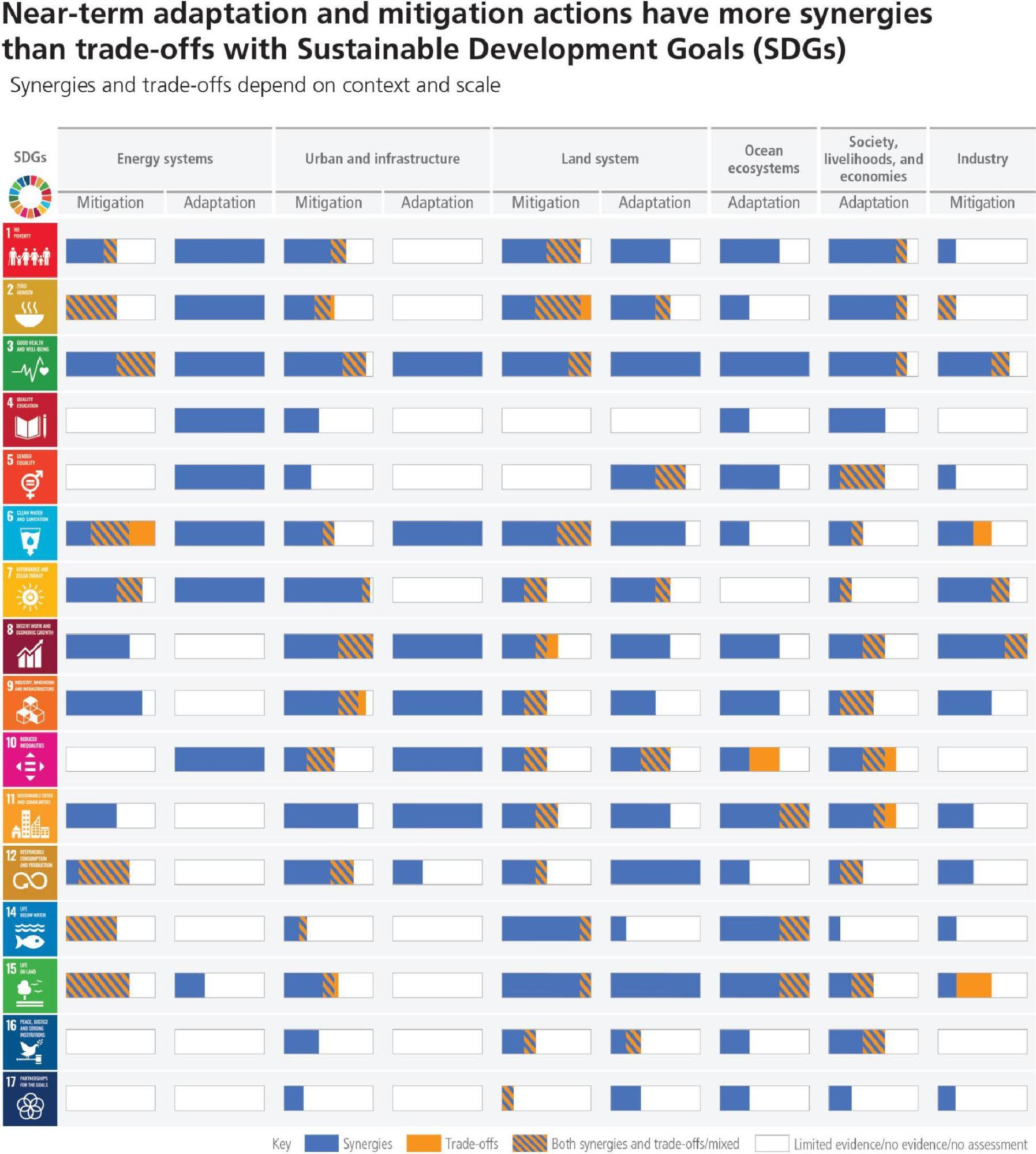 Mitigation and adaptation actions have more synergies than trade-offs with Sustainable Development Goals (SDGs). Synergies and trade-offs depend on context and scale of implementation. Potential trade-offs can be compensated or avoided with additional policies, investments and financial partnerships. (high confidence)
