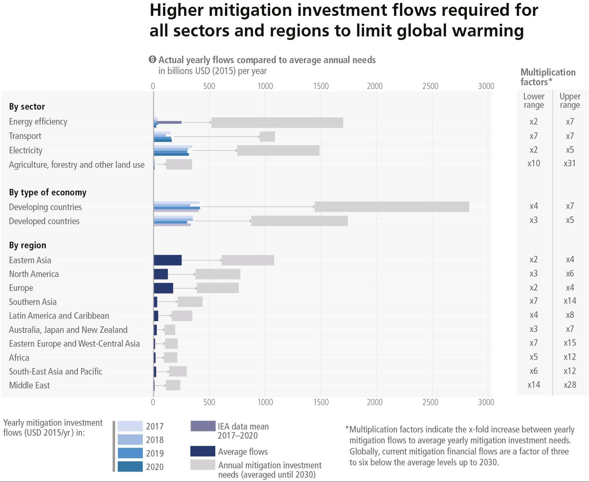 Insufficient financing, and a lack of political frameworks and incentives for finance, are key causes of the implementation gaps for both mitigation and adaptation (high confidence). Financial flows remained heavily focused on mitigation, are uneven, and have developed heterogeneously across regions and sectors (high confidence). In 2018, public and publicly mobilised private climate finance flows from developed to developing countries were below the collective goal under the UNFCCC and Paris Agreement tomobilise USD 100 billion per year by 2020 in the context of meaningful mitigation action and transparency on implementation (medium confidence). Public and private finance flows for fossil fuels are still greater than those for climate adaptation and mitigation (high confidence). The overwhelming majority of tracked climate finance is directed towards mitigation (very high confidence). Nevertheless, average annual modelled investment requirements for 2020 to 2030 in scenarios that limit warming to 2°C or 1.5°C are a factor of three to six greater than current levels, and total mitigation investments (public, private, domestic and international) would need to increase across all sectors and regions (medium confidence). Challenges remain for green bonds and similar products, in particular around integrity and additionality, as well as the limited applicability of these markets to many developing countries (high confidence). {WGII SPM C.3.2, WGII SPM C.5.4; WGIII SPM B.5.4, WGIII SPM E5.1}