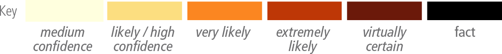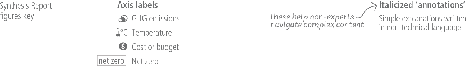 Based on scientific understanding, key findings can be formulated as statements of fact or associated with an assessed level of confidence using the IPCC calibrated language5. The scientific findings are drawn from the underlying reports and arise from their Summary for Policymakers (hereafter SPM), Technical Summary (hereafter TS), and underlying chapters and are indicated by {} brackets. Figure 1.1 shows the Synthesis Report Figures Key, a guide to visual icons that are used across multiple figures within this report.