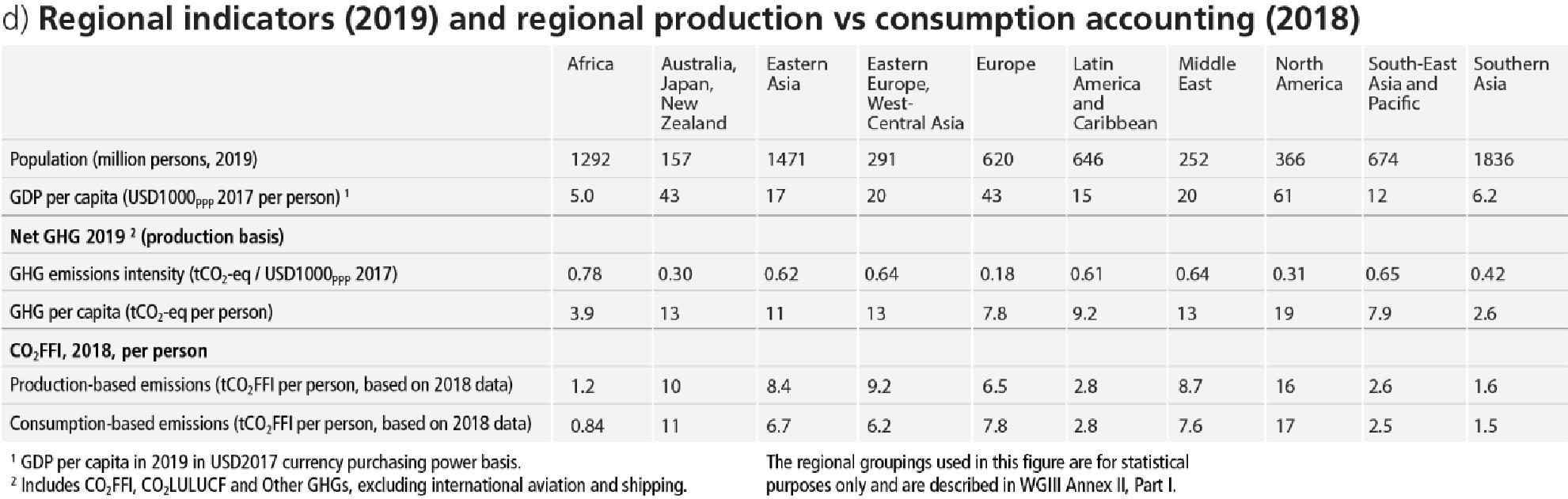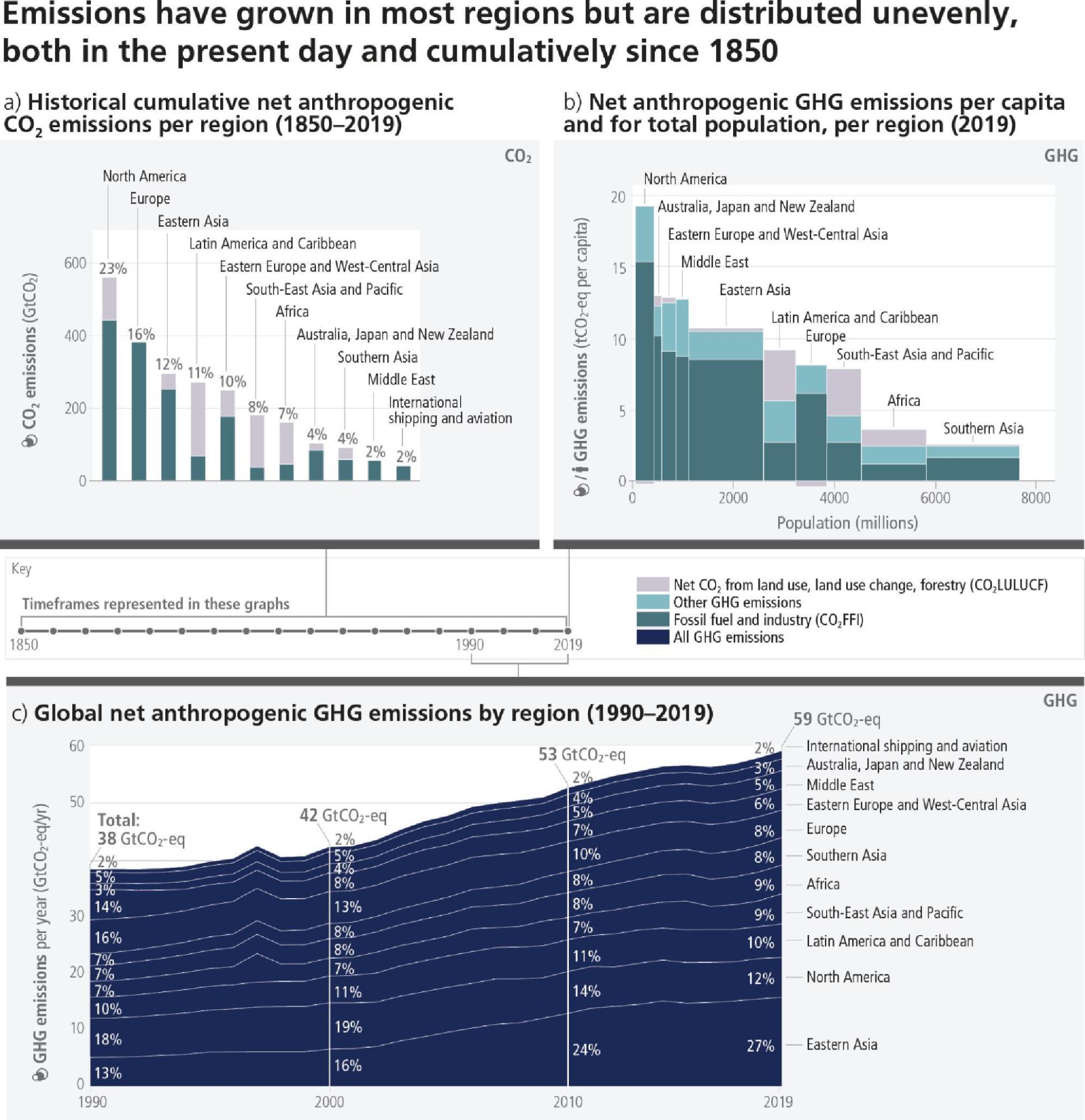 Regional contributions to global human-caused GHG emissions continue to differ widely. Historical contributions of CO2 emissions vary substantially across regions in terms of total magnitude, but also in terms of contributions to CO2-FFI (1650 ± 73 GtCO2-eq) and net CO2-LULUCF (760 ± 220 GtCO2-eq) emissions (Figure 2.2). Variations in regional and national per capita emissions partly reflect different development stages, but they also vary widely at similar income levels. Average per capita net anthropogenic GHG emissions in 2019 ranged from 2.6 tCO2-eq to 19 tCO2-eq across regions (Figure 2.2). Least developed countries (LDCs) and Small Island Developing States (SIDS) have much lower per capita emissions (1.7 tCO2-eq and 4.6 tCO2-eq, respectively) than the global average (6.9 tCO2-eq), excluding CO2-LULUCF. Around 48% of the global population in 2019 lives in countries emitting on average more than 6 tCO2-eq per capita, 35% of the global population live in countries emitting more than 9 tCO2-eq per capita13 (excluding CO2-LULUCF) while another 41% live in countries emitting less than 3 tCO2-eq per capita. A substantial share of the population in these low-emitting countries lack access to modern energy services. (high confidence) {WGIII SPM B.3, WGIII SPM B3.1, WGIII SPM B.3.2, WGIII SPM B.3.3}
