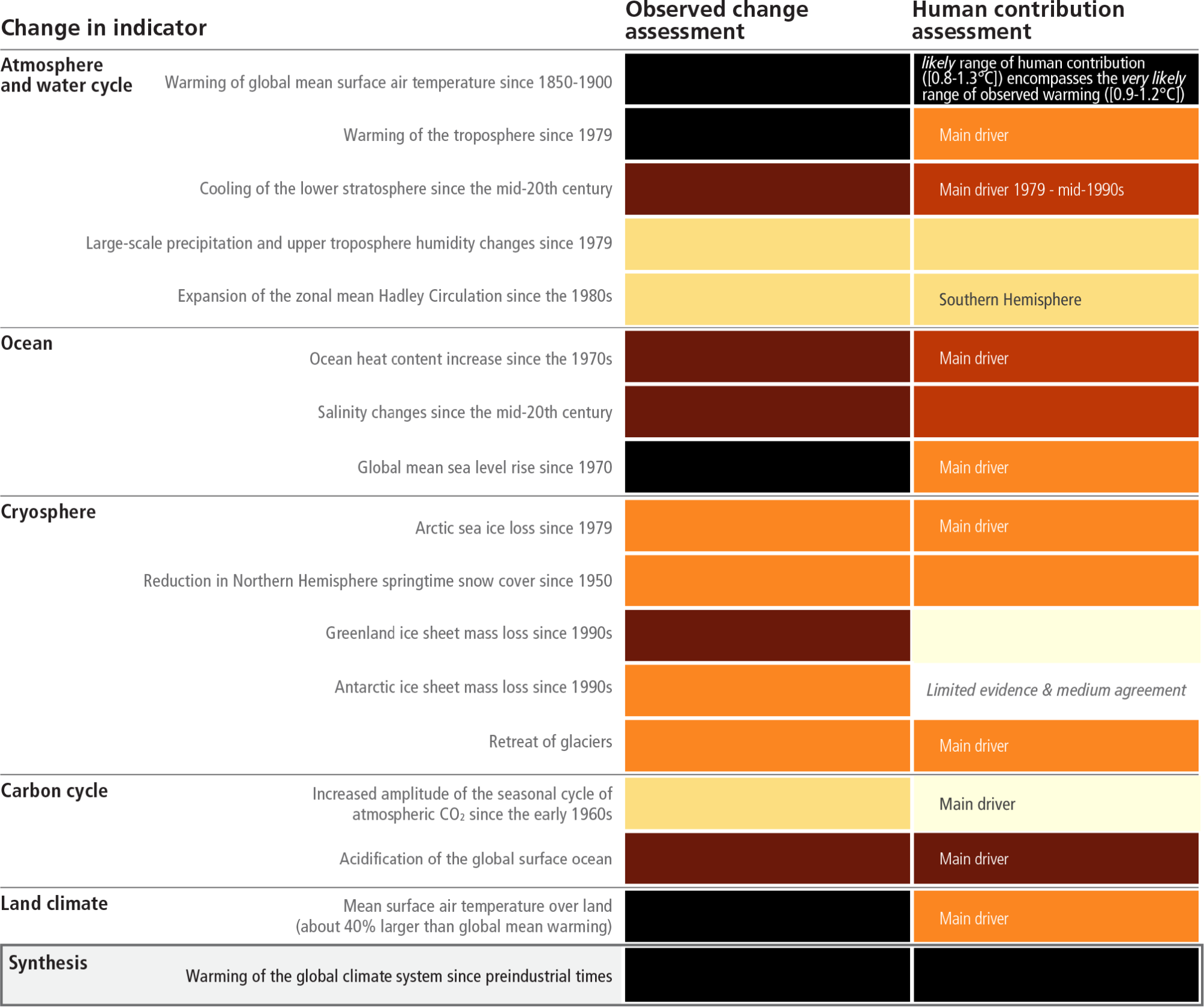 Table 2.1: Assessment of observed changes in large-scale indicators of mean climate across climate system components, and their attribution to human influence. The colour coding indicates the assessed confidence in / likelihood18 of the observed change and the human contribution as a driver or main driver (specified in that case) where available (see colour key). Otherwise, explanatory text is provided. {WGI Table TS.1}