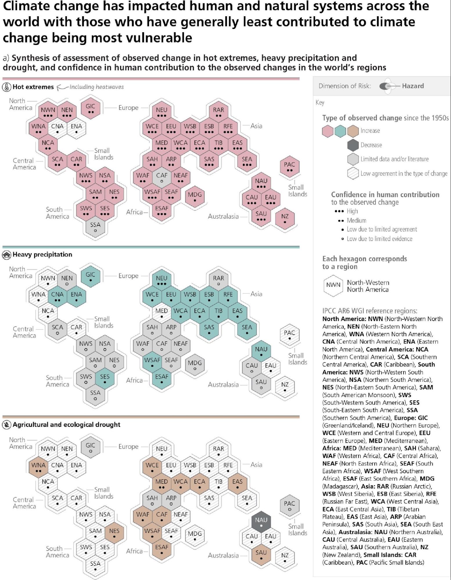 This report integrates the main findings of the AR6 Working Group reports1 and the three AR6 Special Reports2. It recognizes the interdependence of climate, ecosystems and biodiversity, and human societies; the value of diverse forms of knowledge; and the close linkages between climate change adaptation, mitigation, ecosystem health, human well-being and sustainable development. Building on multiple analytical frameworks, including those from the physical and social sciences, this report identifies opportunities for transformative action which are effective, feasible, just and equitable using concepts of systems transitions and resilient development pathways3. Different regional classification schemes4 are used for physical, social and economic aspects, reflecting the underlying literature.