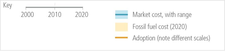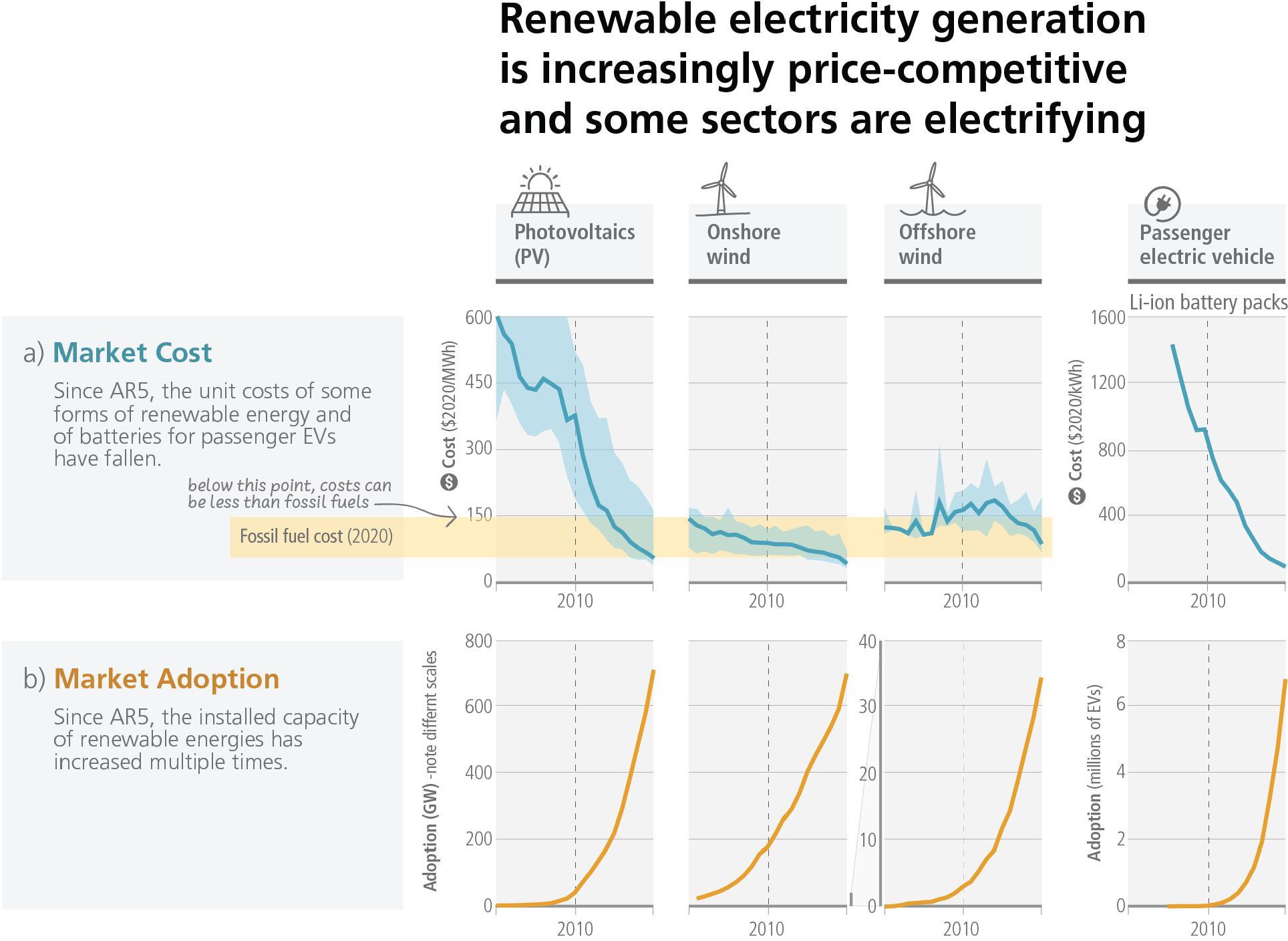 The unit costs of several low-emission technologies, including solar, wind and lithium-ion batteries, have fallen consistently since 2010 (Figure 2.4). Design and process innovations in combination with the use of digital technologies have led to near-commercial availability of many low or zero emissions options in buildings, transport and industry. From 2010 to 2019, there have been sustained decreases in the unit costs of solar energy (by 85%), wind energy (by 55%), and lithium-ion batteries (by 85%), and large increases in their deployment, e.g., >10× for solar and >100× for electric vehicles (EVs), albeit varying widely across regions (Figure 2.4). Electricity from PV and wind is now cheaper than electricity from fossil sources in many regions, electric vehicles are increasingly competitive with internal combustion engines, and large-scale battery storage on electricity grids is increasingly viable. In comparison to modular small-unit size technologies, the empirical record shows that multiple large-scale mitigation technologies, with fewer opportunities for learning, have seen minimal cost reductions and their adoption has grown slowly. Maintaining emission-intensive systems may, in some regions and sectors, be more expensive than transitioning to low emission systems. (high confidence) {WGIII SPM B.4, WGIII SPM B.4.1, WGIII SPM C.4.2, WGIII SPM C.5.2, WGIII SPM C.7.2, WGIII SPM C.8, WGIII Figure SPM.3, WGIII Figure SPM.3}