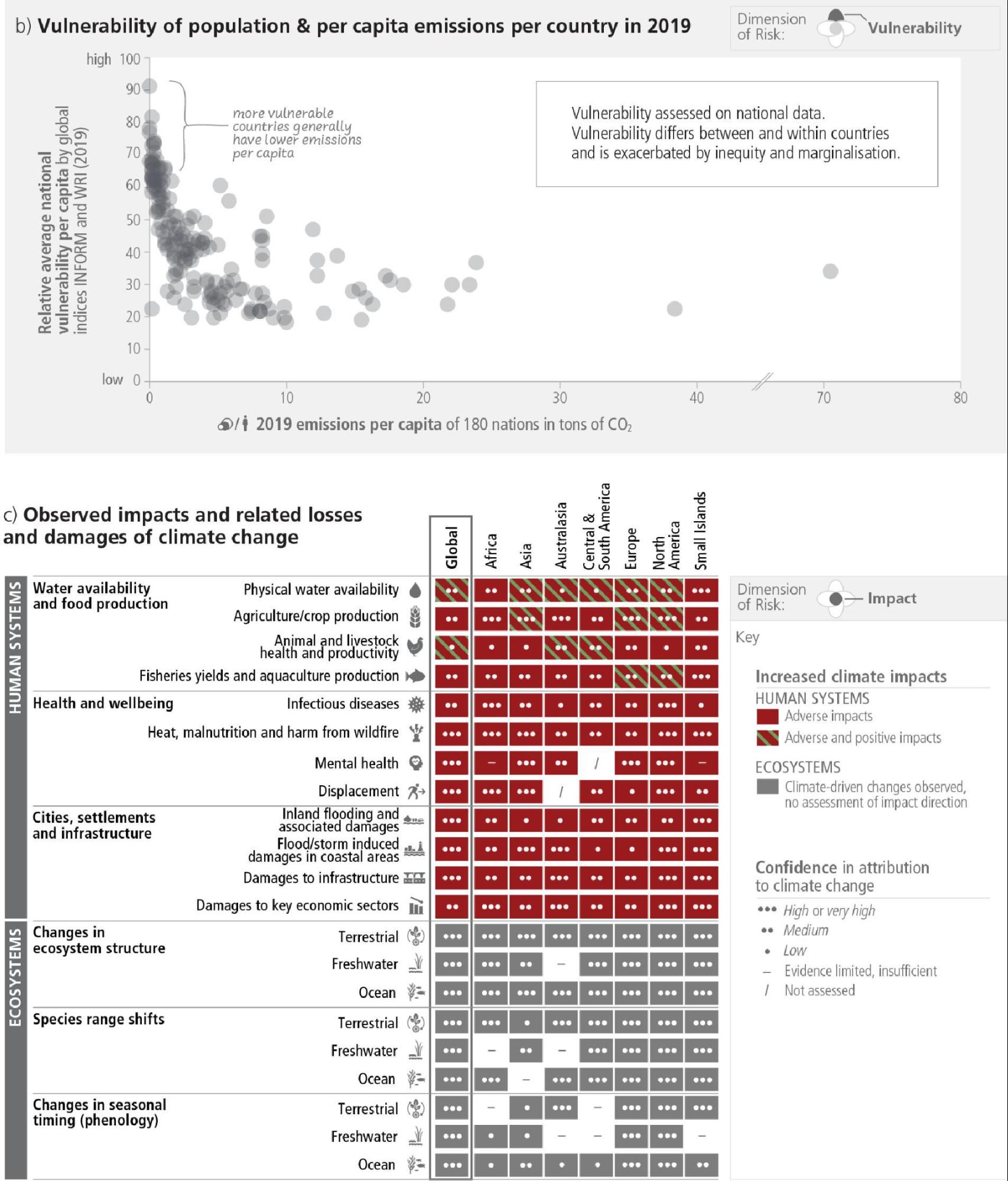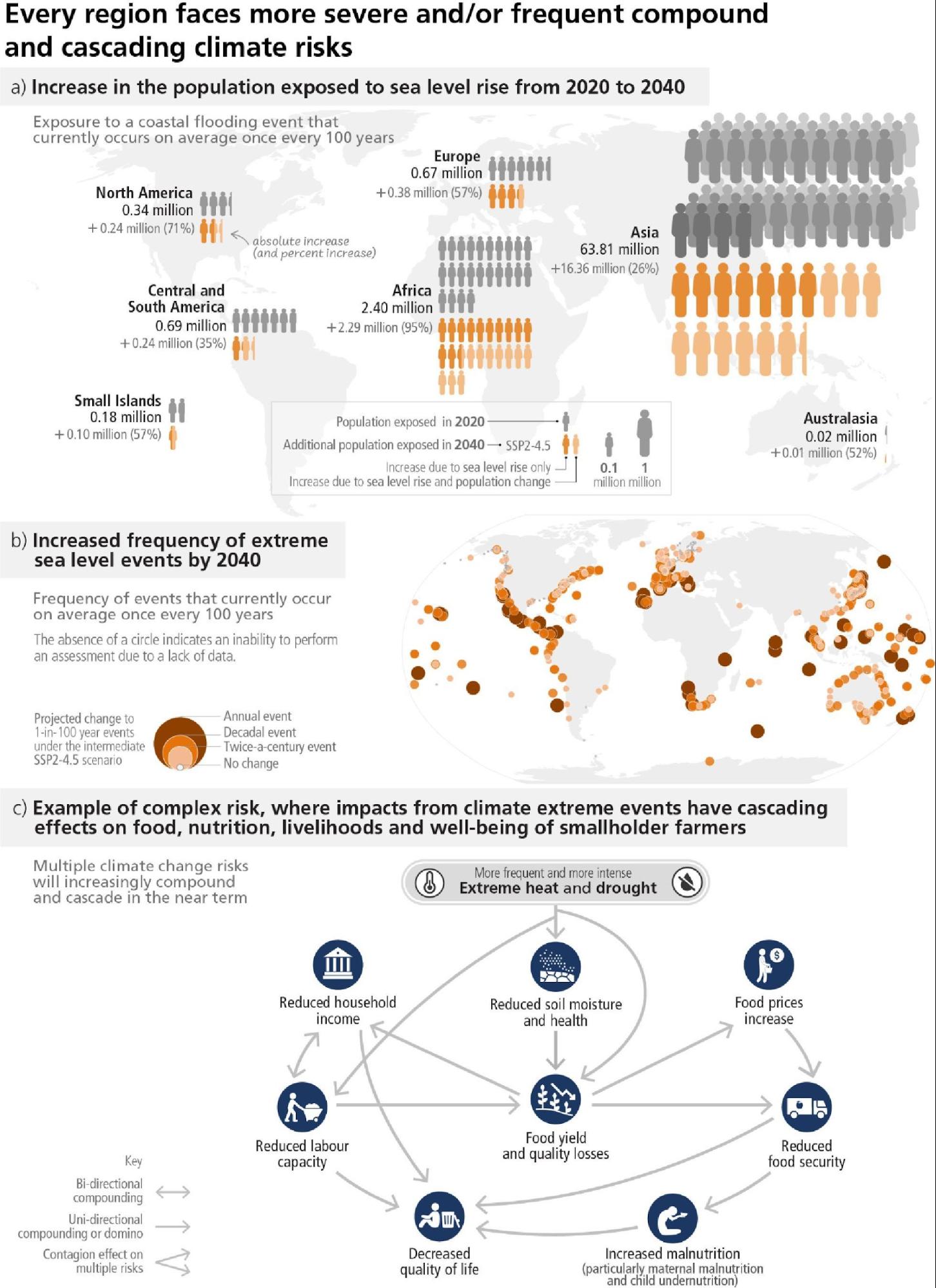 Panel (c) Climate hazards can initiate risk cascades that affect multiple sectors and propagate across regions following complex natural and societal connections. This example of a compound heat wave and a drought event striking an agricultural region shows how multiple risks are interconnected and lead to cascading biophysical, economic, and societal impacts even in distant regions, with vulnerable groups such as smallholder farmers, children and pregnant women particularly impacted. {WGI Figure 9.32; WGII SPM B4.3, WGII SPM B1.3, WGII SPM B.5.1, WGII TS Figure TS.9, WGII TS Figure TS.10 (c), WGII Fig 5.2, WGII TS.B.2.3, WGII TS.B.2.3, WGII TS.B.3.3, WGII 9.11.1.2}