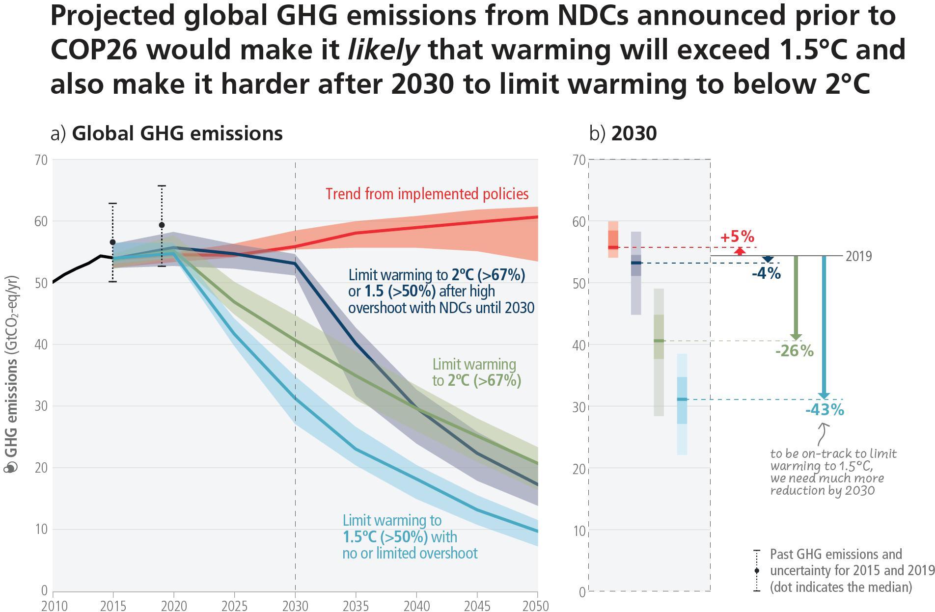 Global GHG emissions in 2030 associated with the implementation of NDCs announced prior to COP2634 would make it likely that warming will exceed 1.5°C during the 21st century and would makeit harder to limit warming below 2°C – if no additional commitments are made or actions taken (Figure 2.5, Table 2.2). A substantial 'emissions gap’ exists as global GHG emissions in 2030 associated with the implementation of NDCs announced prior to COP26 would be similar to or only slightly below 2019 emission levels and higher than those associated with modelled mitigation pathways that limit warming to 1.5°C (>50%) with no or limited overshoot or to 2°C (>67%), assuming immediate action, which implies deep, rapid and sustained global GHG emission reductions this decade (high confidence) (Table 2.2, Table 3.1, 4.1).35 The magnitude of the emissions gap depends on the global warming level considered and whether only unconditional or also conditional elements of NDCs36 are considered (high confidence) (Table 2.2). Modelled pathways that are consistent with NDCs announced prior to COP26 until 2030 and assume no increase in ambition thereafter have higher emissions, leading to a median global warming of 2.8 [2.1–3.4]°C by 2100 (medium confidence). If the 'emission gap’ is not reduced, global GHG emissions in 2030 consistent with NDCs announced prior to COP26 make it likely that warming will exceed 1.5°C during the 21st century, while limiting warming to 2°C (>67%) would imply an unprecedented acceleration of mitigation efforts during 2030–2050 (medium confidence) (see Section 4.1, CSB2). {WGIII SPM B.6, WGIII SPM B.6.1, WGIII SPM B.6.3, WGIII SPM B.6.4, WGIII SPM C.1.1}.
