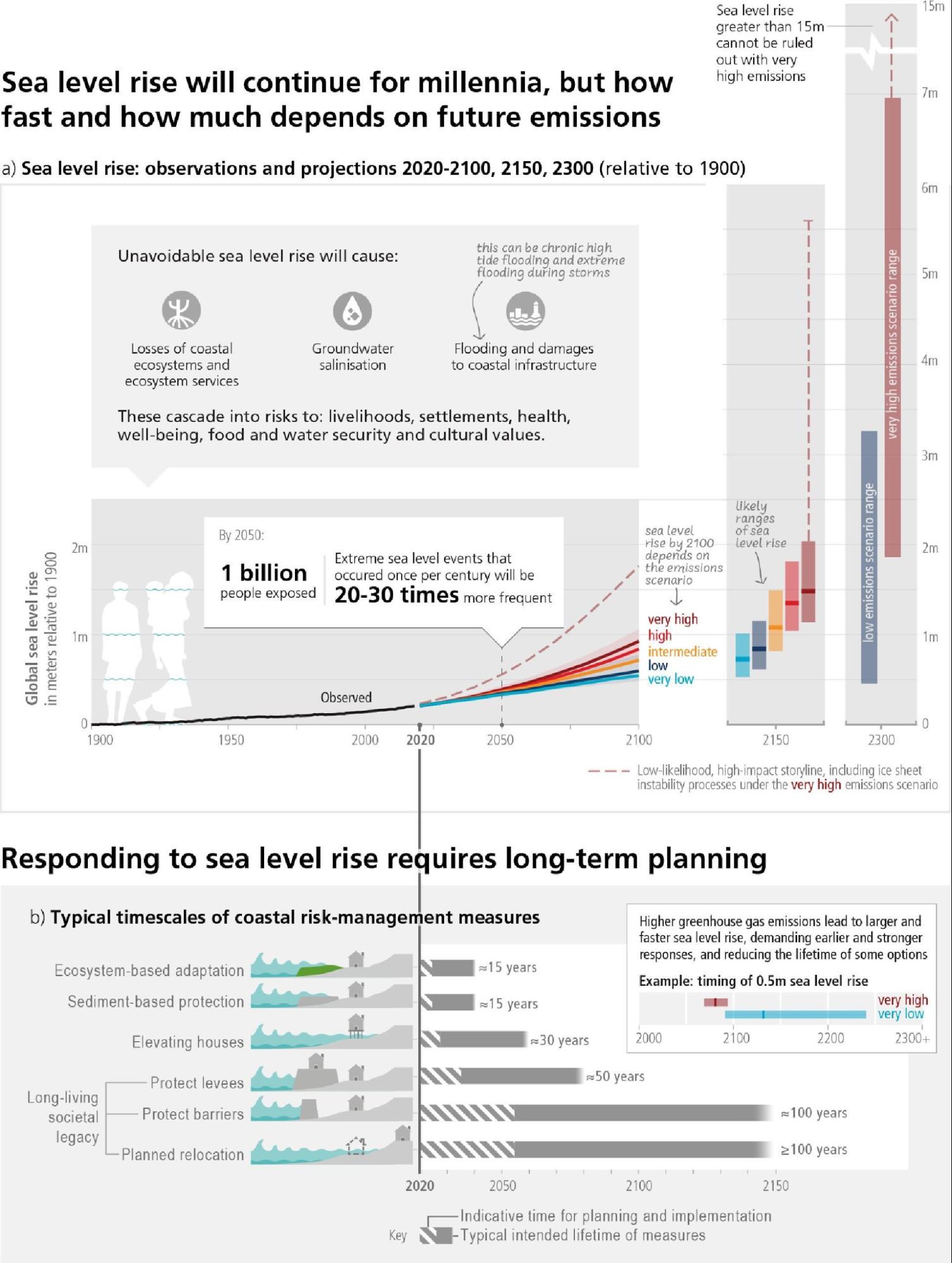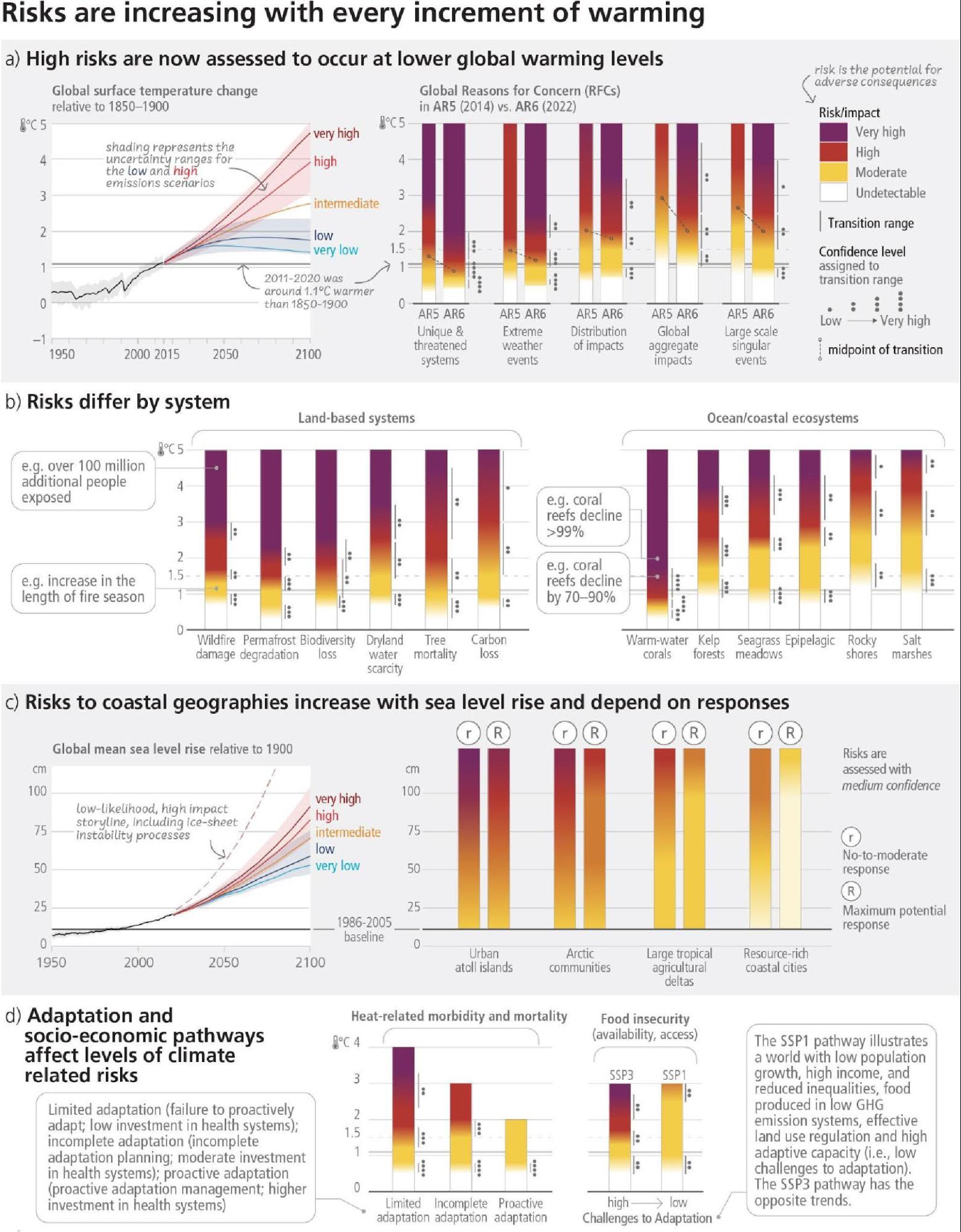 - Continued sea level rise and increased frequency and magnitude of extreme sea level events encroaching on coastal human settlements and damaging coastal infrastructure (high confidence), committing low-lying coastal ecosystems to submergence and loss (medium confidence), expanding land salinization (very high confidence), with cascading to risks to livelihoods, health, well-being, cultural values, food and water security (high confidence) (Figure 3.4, 4.3). {WGI SPM C.2.5, WGI SPM C.2.6; WGII SPM B.3.1, WGII SPM B.5.2; SRCCL SPM A.5.6; SROCC SPM B.3.4, SROCC SPM 3.6, SROCC SPM B.9.1}.