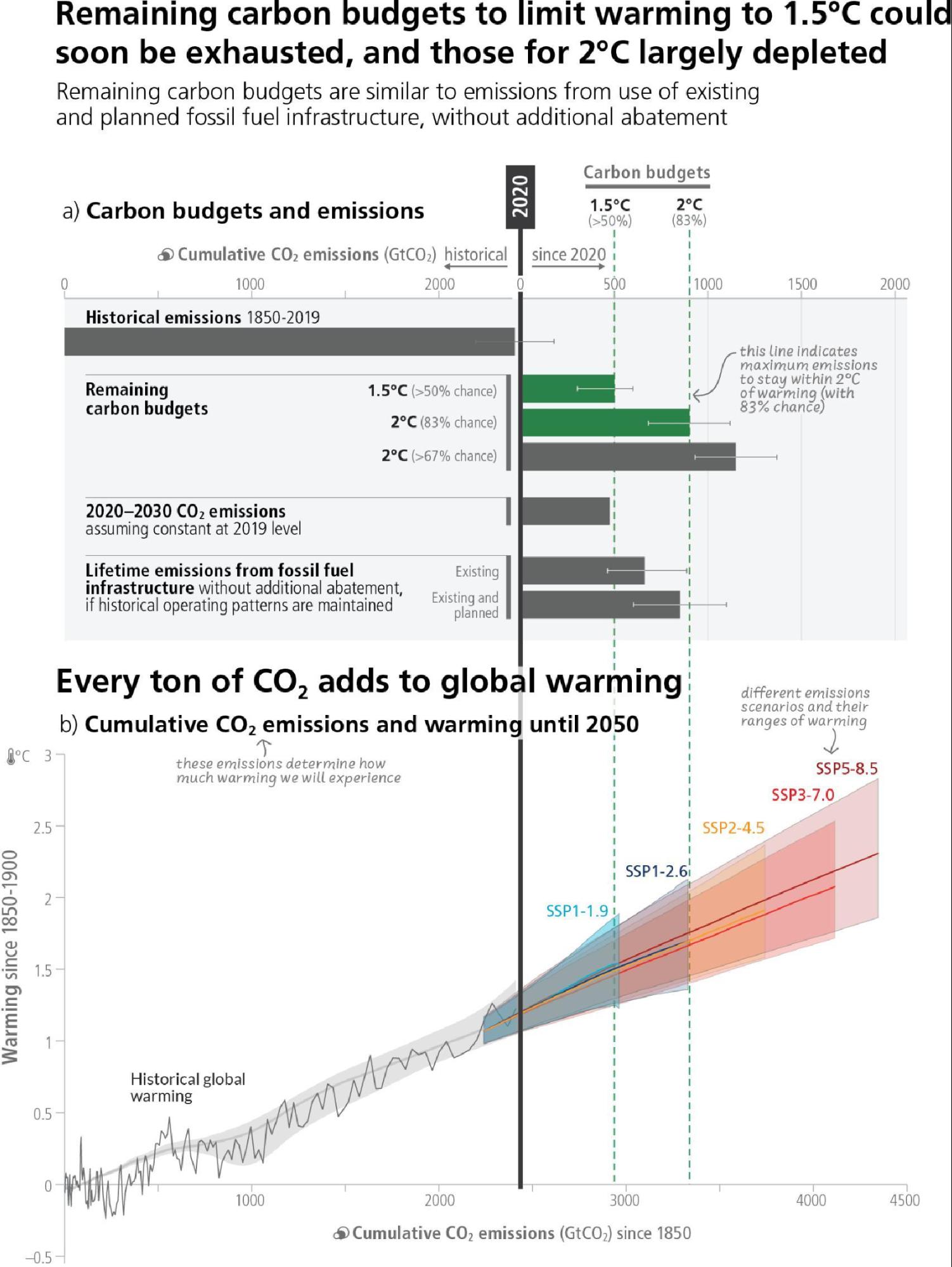 Projected cumulative future CO2 emissions over the lifetime of existing fossil fuel infrastructure without additional abatement38 exceed the total cumulative net CO2 emissions in pathways that limit warming to 1.5°C (>50%) with no or limited overshoot. They are approximately equal to total cumulative net CO2 emissions in pathways that limit warming to 2°C with a likelihood of 83%39 (see Figure 3.5). Limiting warming to 2°C (>67%) or lower will result in stranded assets. About 80% of coal, 50% of gas, and 30% of oil reserves cannot be burned and emitted if warming is limited to 2°C. Significantly more reserves are expected to remain unburned if warming is limited to 1.5°C. (high confidence) {WGIII SPM B.7, WGIII Box. 6.13}