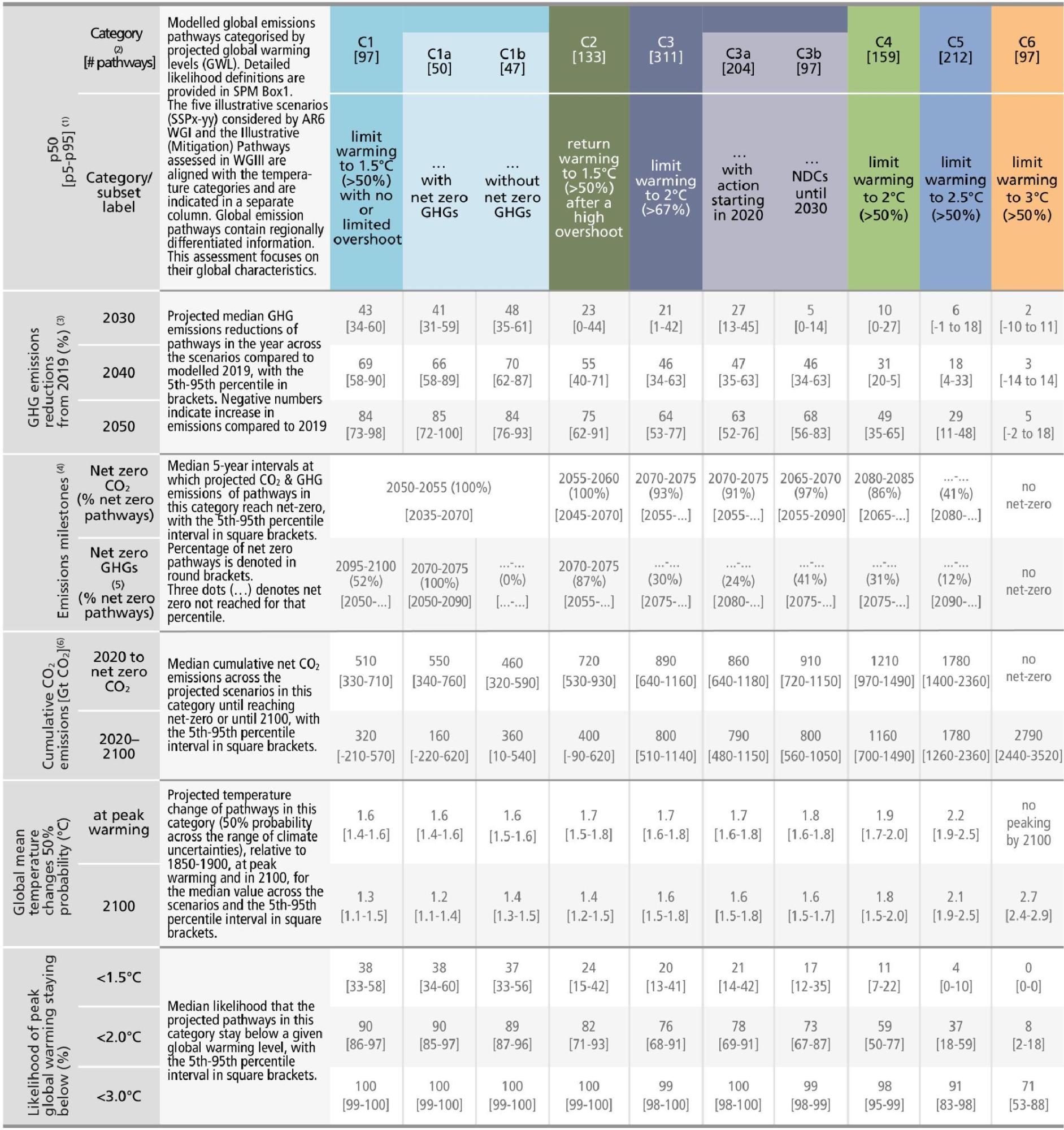 – Limit to 1.5°C (>50%) with no or limited overshoot: Pathways limiting warming to 1.5°C with no or limited overshoot (C1, WGIII Table SPM.2 C1).