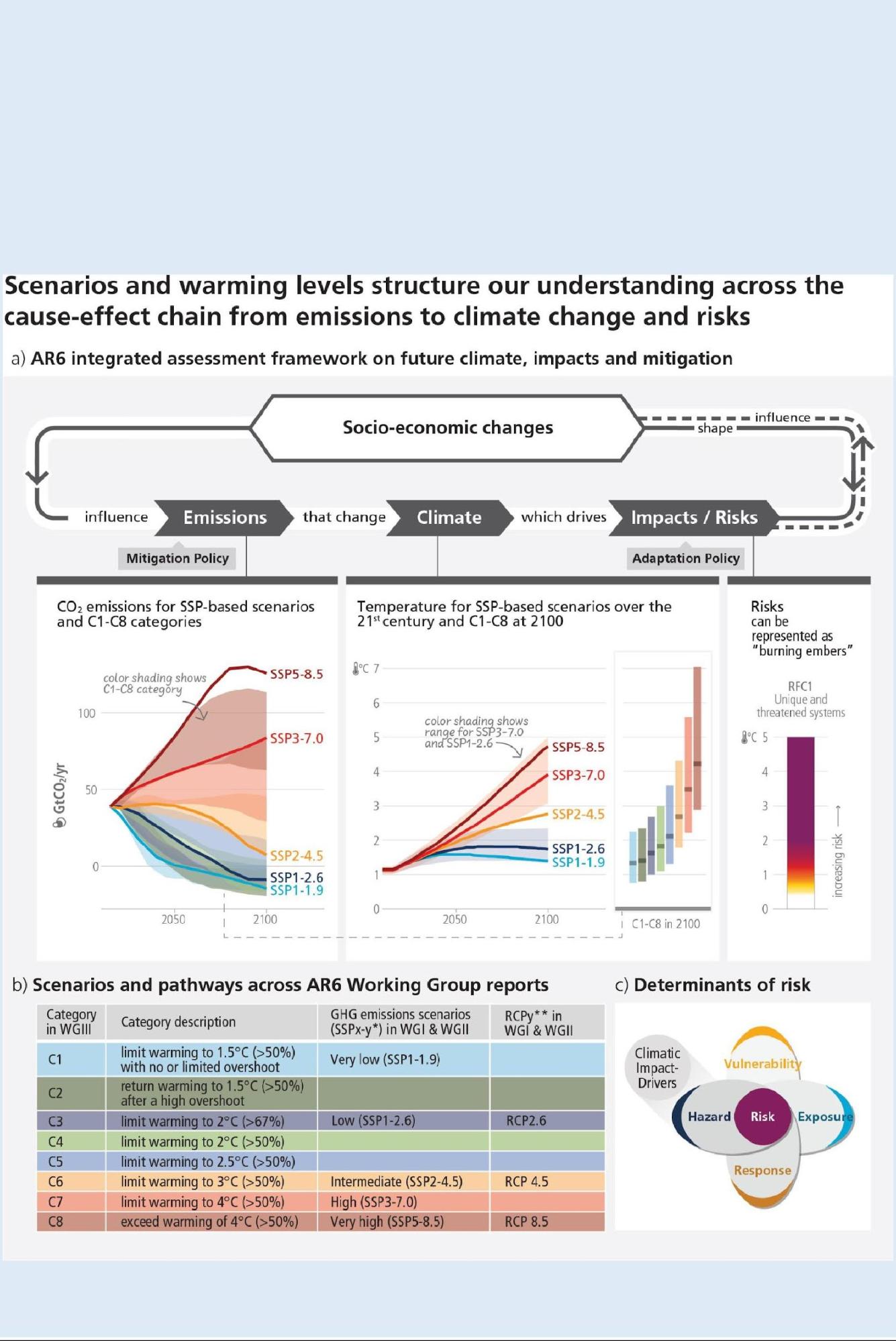 WGI assessed the climate response to five illustrative scenarios based on SSPs48 that cover the range of possible future development of anthropogenic drivers of climate change found in the literature. These scenarios combine socio-economic assumptions, levels of climate mitigation, land use and air pollution controls for aerosols and non-CH4 ozone precursors. The high and very high GHG emissions scenarios (SSP3-7.0 and SSP5-8.5) have CO2 emissions that roughly double from current levels by 2100 and 2050, respectively49. The intermediate GHG emissions scenario (SSP2-4.5) has CO2 emissions remaining around current levels until the middle of the century. The very low and low GHG emissions scenarios (SSP1-1.9 and SSP1-2.6) have CO2 emissions declining to net zero around 2050 and 2070, respectively, followed by varying levels of net negative CO2 emissions. In addition, Representative Concentration Pathways (RCPs)50 were used by WGI and WGII to assess regional climate changes, impacts and risks. {WGI Box SPM.1} (Cross-Section Box.2, Figure 1)
