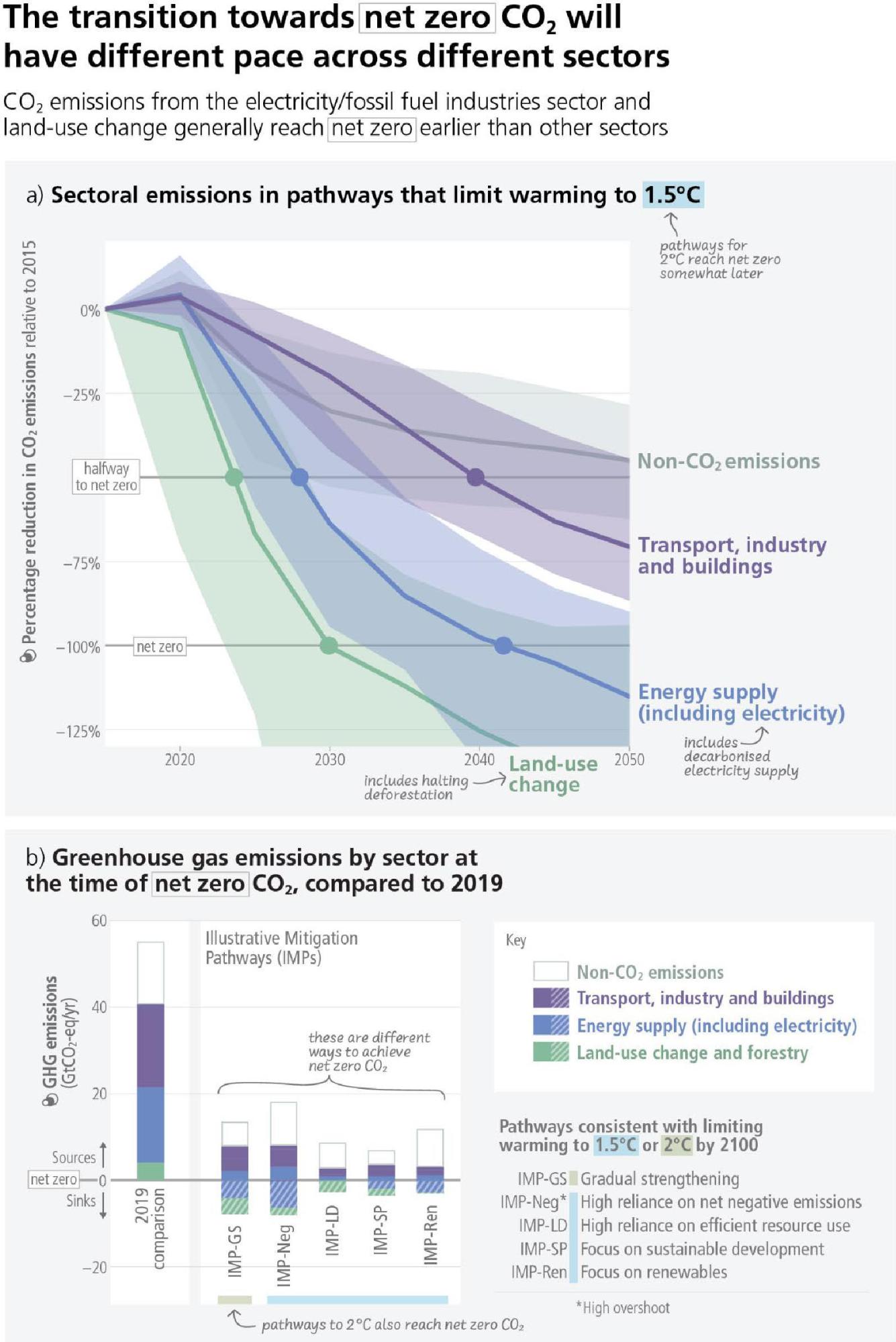 Global net zero CO2 or GHG emissions can be achieved even if some sectors and regions are net emitters, provided that others reach net negative emissions (see Figure 4.1). The potential and cost of achieving net zero or even net negative emissions vary by sector and region. If and when net zero emissions for a given sector or region are reached depends on multiple factors, including the potential to reduce GHG emissions and undertake carbon dioxide removal, the associated costs, and the availability of policy mechanisms to balance emissions and removals between sectors and countries. (high confidence) {WGIII Box TS.6, WGIII Cross-Chapter Box 3}.