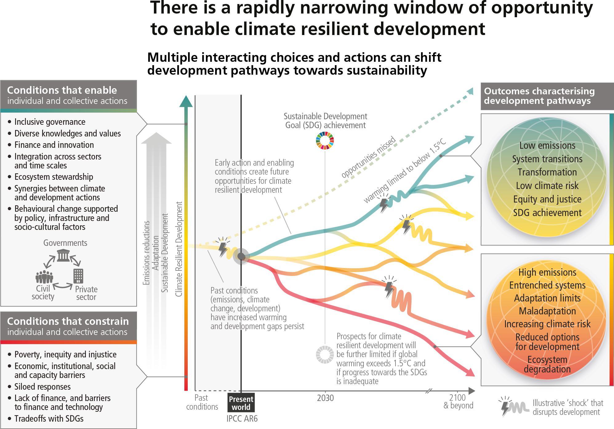 Rapid and far-reaching transitions across all sectors and systems are necessary to achieve deep emissions reductions and secure a liveable and sustainable future for all (high confidence). System transitions94 consistent with pathways that limit warming to 1.5°C (>50%) with no or limited overshoot are more rapid and pronounced in the near-term than in those that limit warming to 2°C (>67%) (high confidence). Such a systemic change is unprecedented in terms of scale, but not necessarily in terms of speed (medium confidence). The system transitions make possible the transformative adaptation required for high levels of human health and well-being, economic and social resilience, ecosystem health, and planetary health. {WGII SPM A, WGII SPM Figure SPM.1; WGIII SPM C.3; SR1.5 SPM C.2, SR1.5 SPM C.2.1, SR1.5 SPM C.2, SR1.5 SPM C.5}